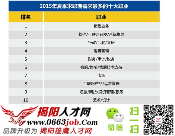 圖為2015年夏季求職期需求最多的十大職業(yè),也就是目前比較稀缺人才的行業(yè),有些職業(yè)是企業(yè)之中不可或缺的職位,有些職位則是由于行業(yè)的蓬勃發(fā)展而不斷增加的職位??傊?,這些職位決定你未來(lái)做什么,選擇時(shí)一定要慎之又慎。