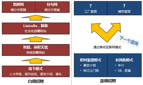 通過分析整個招聘行業(yè),我們看到白領(lǐng)招聘已經(jīng)互聯(lián)網(wǎng)化并進(jìn)入細(xì)分競爭階段。由于智能手機的普及,藍(lán)領(lǐng)招聘剛剛進(jìn)入移動互聯(lián)網(wǎng)化的窗口期,尚未有成型的玩家出現(xiàn)。信息源:揭陽人才網(wǎng)_m.zgkywl.com