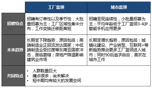 單就藍(lán)領(lǐng)群體的劃分來看,工廠藍(lán)領(lǐng)與城市藍(lán)領(lǐng)的招聘也具備不同的特點: