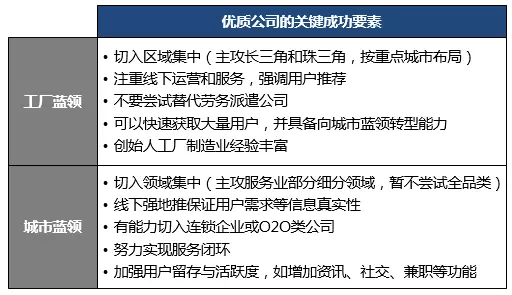 工廠藍(lán)領(lǐng)目前主要依靠線下勞務(wù)派遣公司,互聯(lián)網(wǎng)模式需要配合較強的線下運營能力才可能切入,可以考慮的方向為: